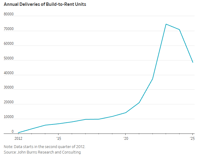 For context: BTR was growing well before the executive order. Since 2012, over 321,000 BTR homes have been built, with more than 75% built in the past five years. Rising rates and home prices had already pushed investors toward purpose-built rentals from builders like D.R. Horton and Lennar.