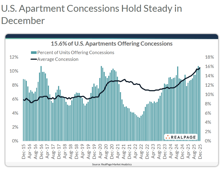 U.S. apartment concessions held steady in December, with 15.6% of stabilized units offering discounts averaging about 10.5%, the highest December usage rate since 2016.
