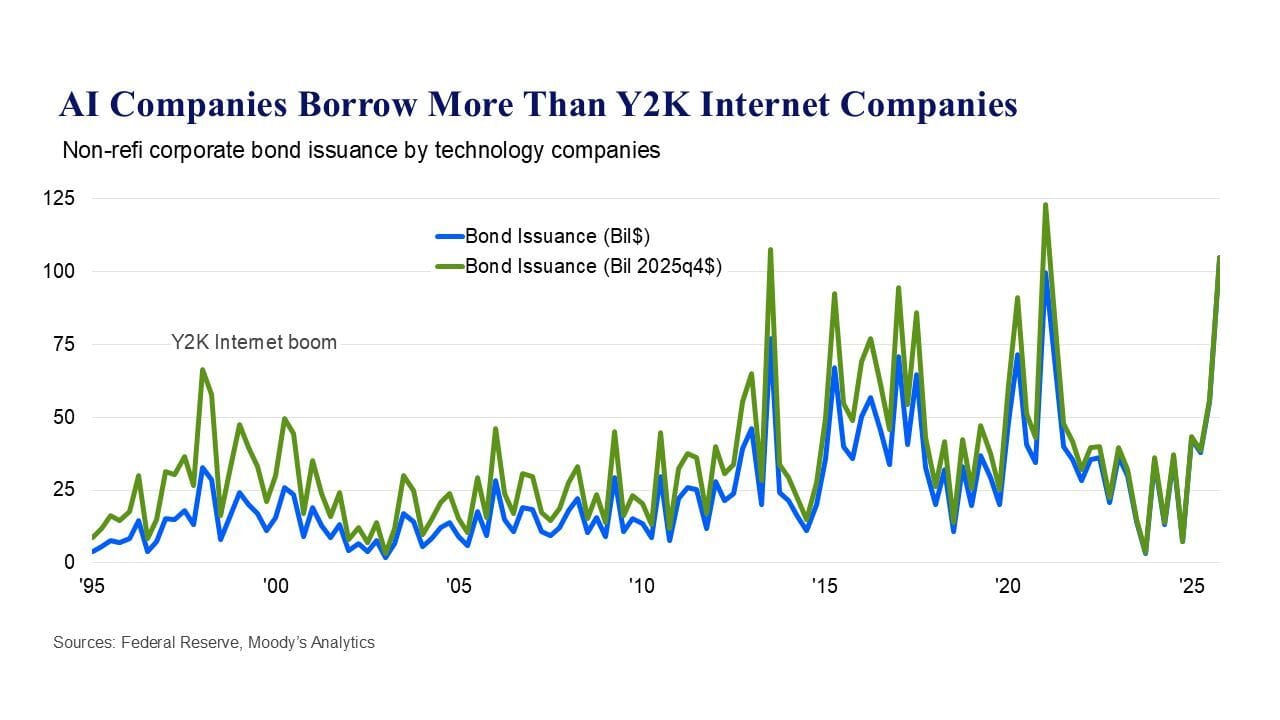 Tech companies’ bond issuance, driven heavily by today’s AI giants, has already surpassed Y2K-era levels in nominal terms and sits near record highs even after inflation.