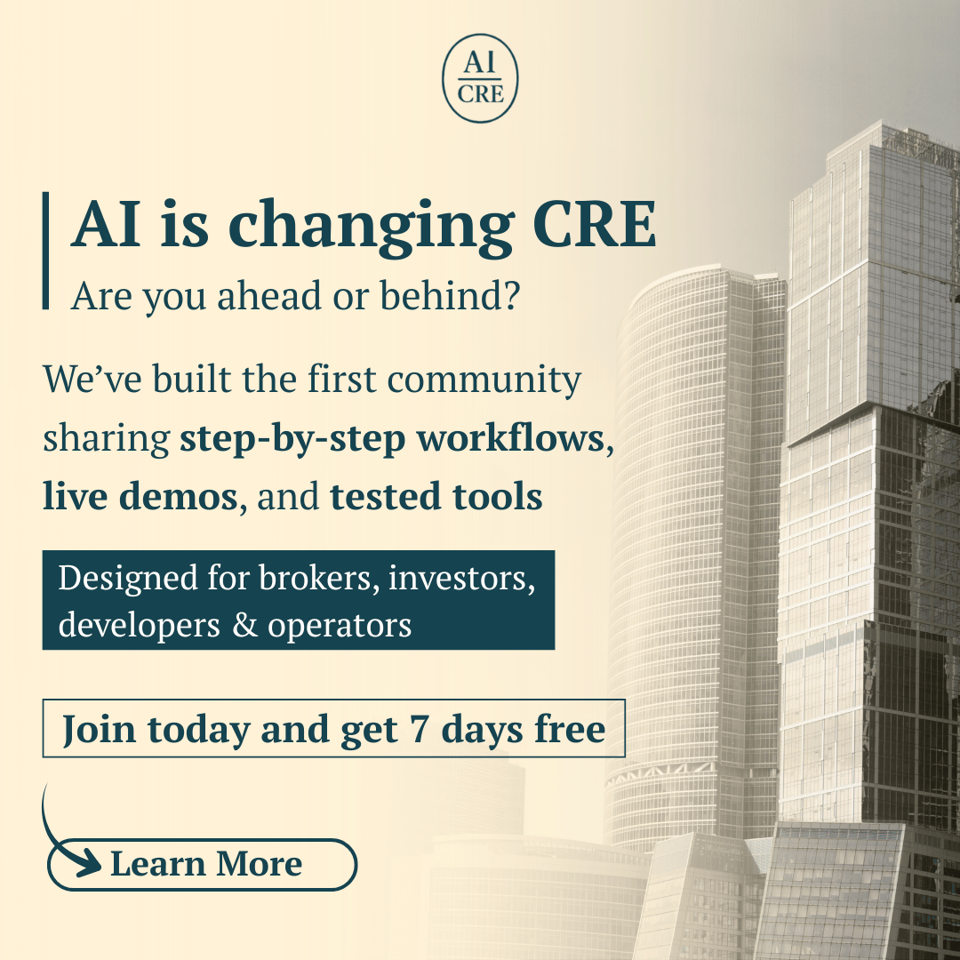 Get access to weekly roundtables, live trainings, step by step workflows, and an active community of 400+ CRE pros. Don’t get left behind, see how AI is reshaping the industry and your business.