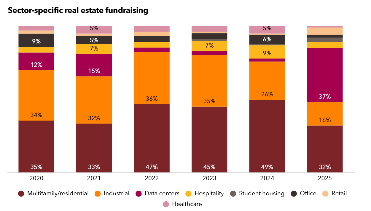 Data in the spotlight: Investor preferences shifted sharply in 2025, with data centers attracting 37% of all capital, up from just 2% in 2024. The surge was driven by large funds like Blue Owl’s $7B and Principal’s $3.6B vehicles, while sectors like multifamily and industrial saw notable declines.