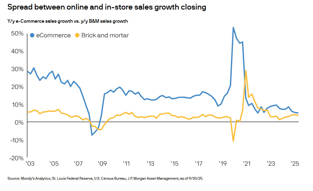 The gap between e-commerce and in-store retail sales growth has steadily narrowed, signaling that online shopping’s pandemic-era surge is fading and brick-and-mortar sales are catching up.
